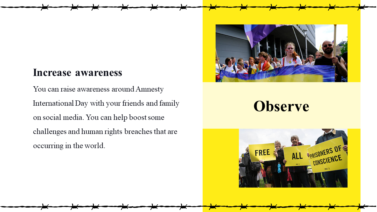 Worldwide Amnesty Day is a day of global activism to support human rights and demand the release of all political prisoners. Every year on December 10. A PPT presentation about International Amnesty Day has this 36-slide package. It provides details on the origins of the holiday, the status of human rights globally today, and how to join the cause. Several pictures, graphs, and video clips are also included in the display to help highlight the key ideas. The package works well with PPT and Google Slides and is simple to update and customize. This package is excellent for boosting awareness of human rights and motivating action. To boom, try.